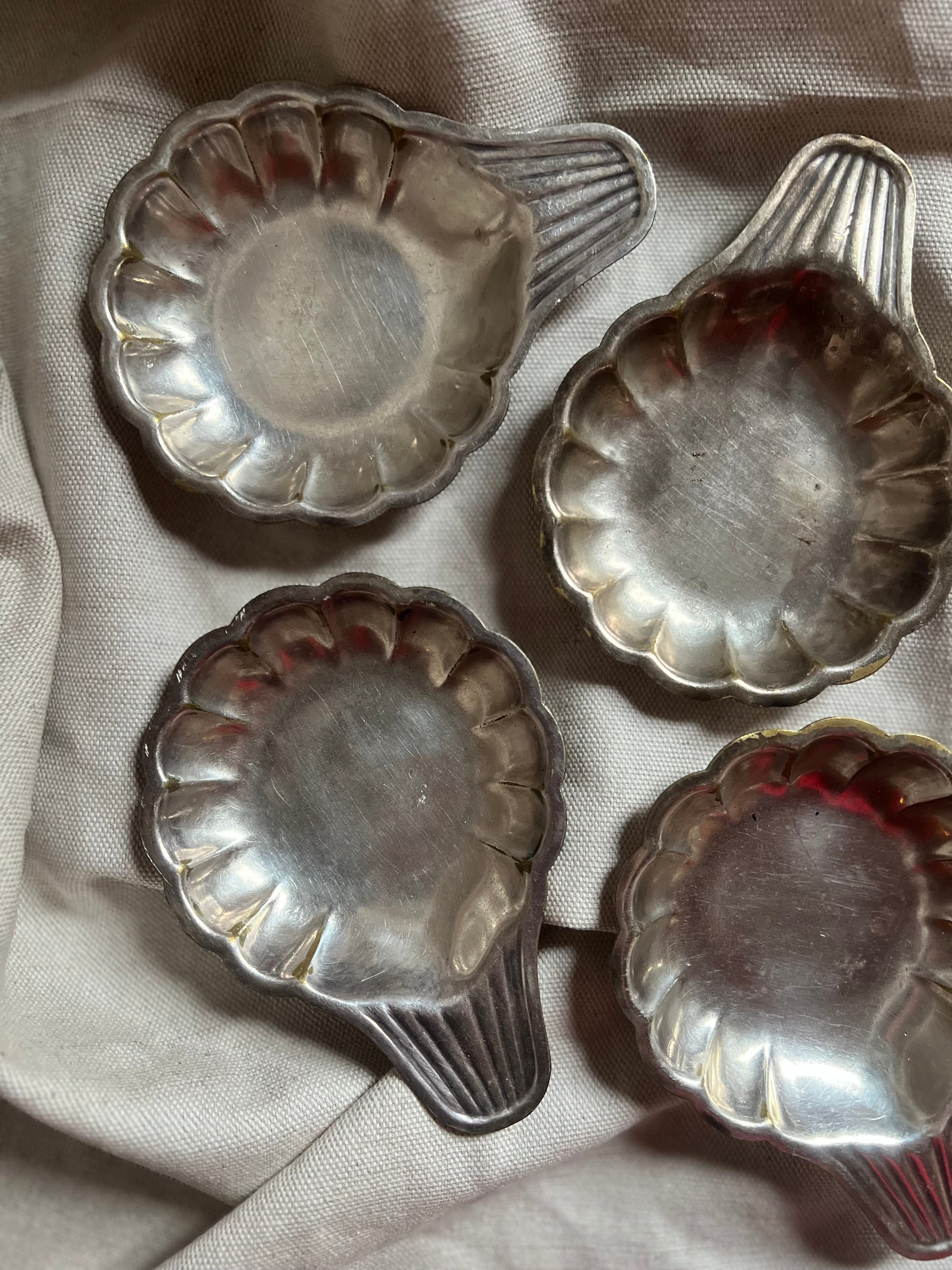 Elegant set of six French scallop dishes in the traditional shell form closely associated with coastal dining and formal table service. The silver plating shows a soft, aged patina with gentle wear and tonal variation, consistent with age and use. Classic coquille Saint-Jacques form with fluted shell detailing and integrated handles, traditionally used for serving seafood, escargots, or individual hors d’oeuvres.