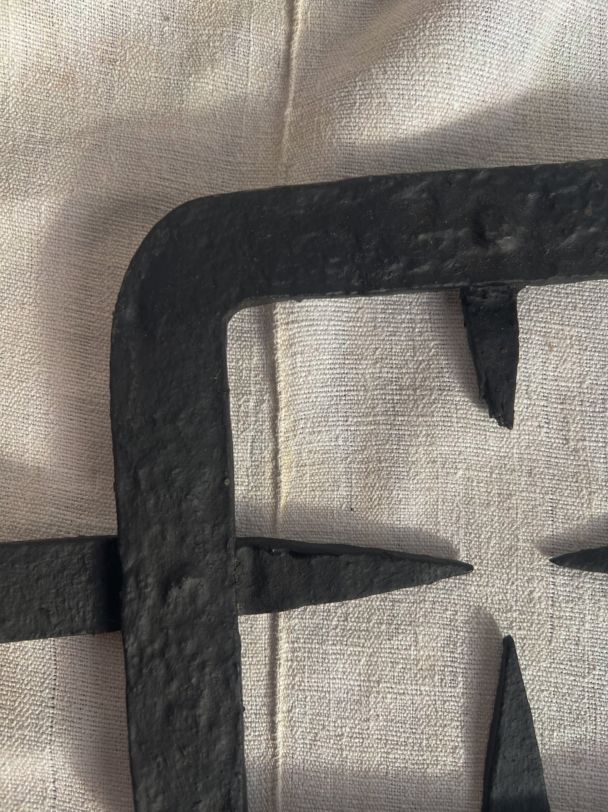 This antique French wrought iron trivet features a distinctive square top with cross-cut openings and a hand-forged hanging loop. Once used for supporting hot pots near the hearth, it displays the solid craftsmanship and utilitarian beauty of 19th-century ironwork. The piece shows hammer marks, natural patina, and slight irregularities that testify to its handmade origin. Whether displayed on a wall or used as a decorative accent, it brings a touch of authentic rural history to the home.