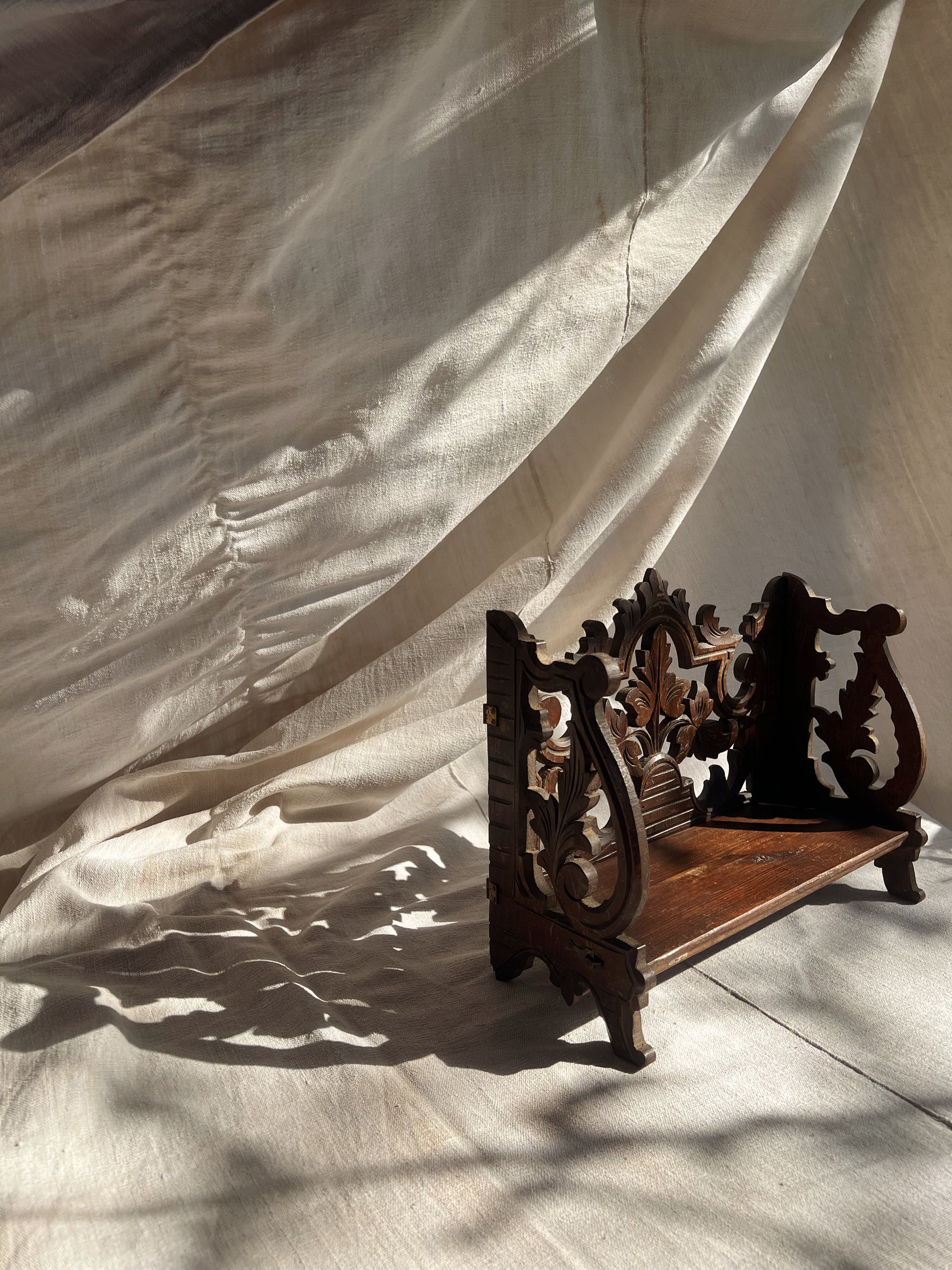 This antique French folding wall shelf features intricate hand-carved floral and foliate details with an arched top and scrolled sides. Crafted from dark-stained wood, it folds flat when not in use and opens into a single shelf supported by delicate fretwork panels. This shelf would have been used to display devotional objects, small books, or curios.