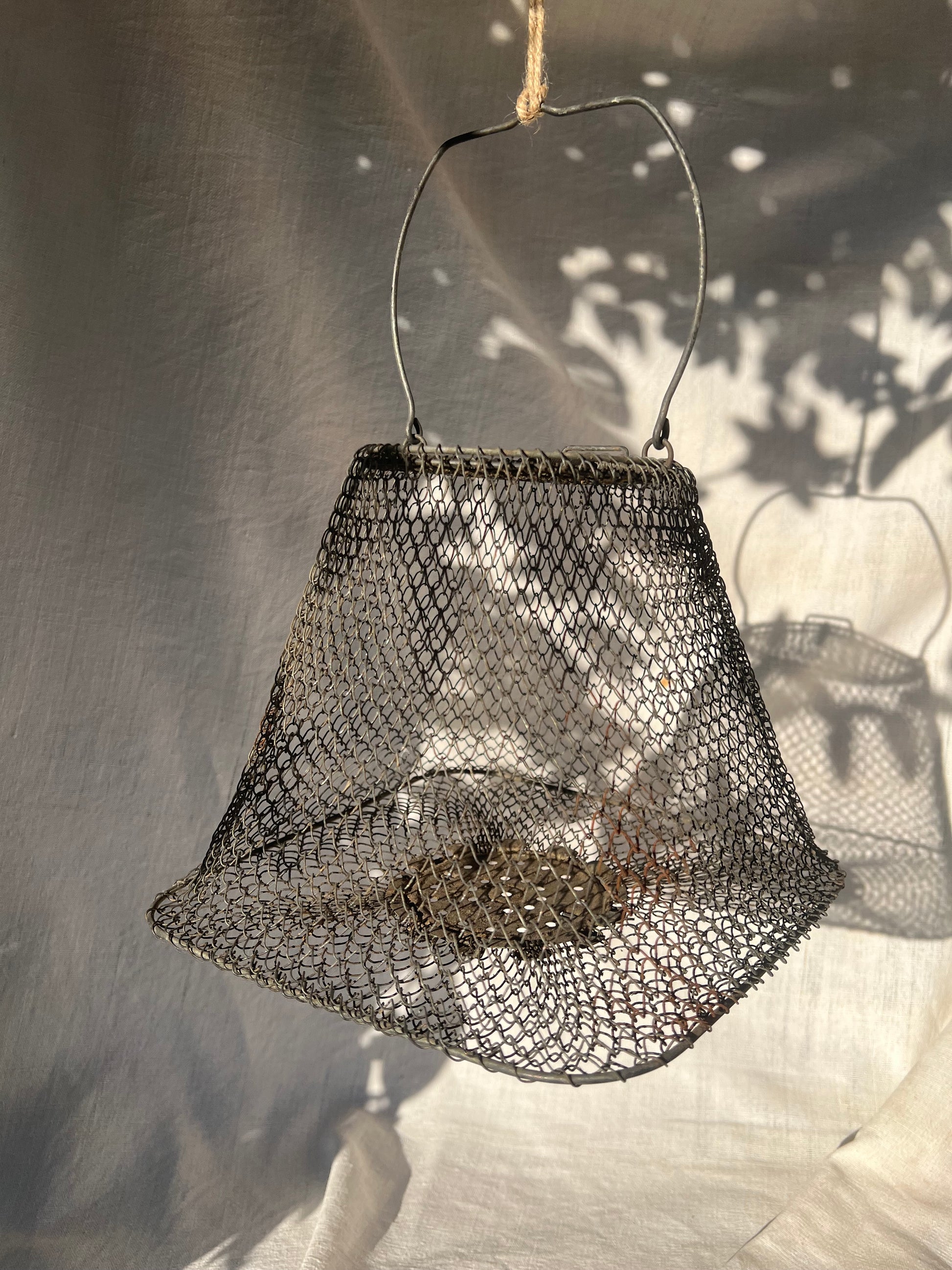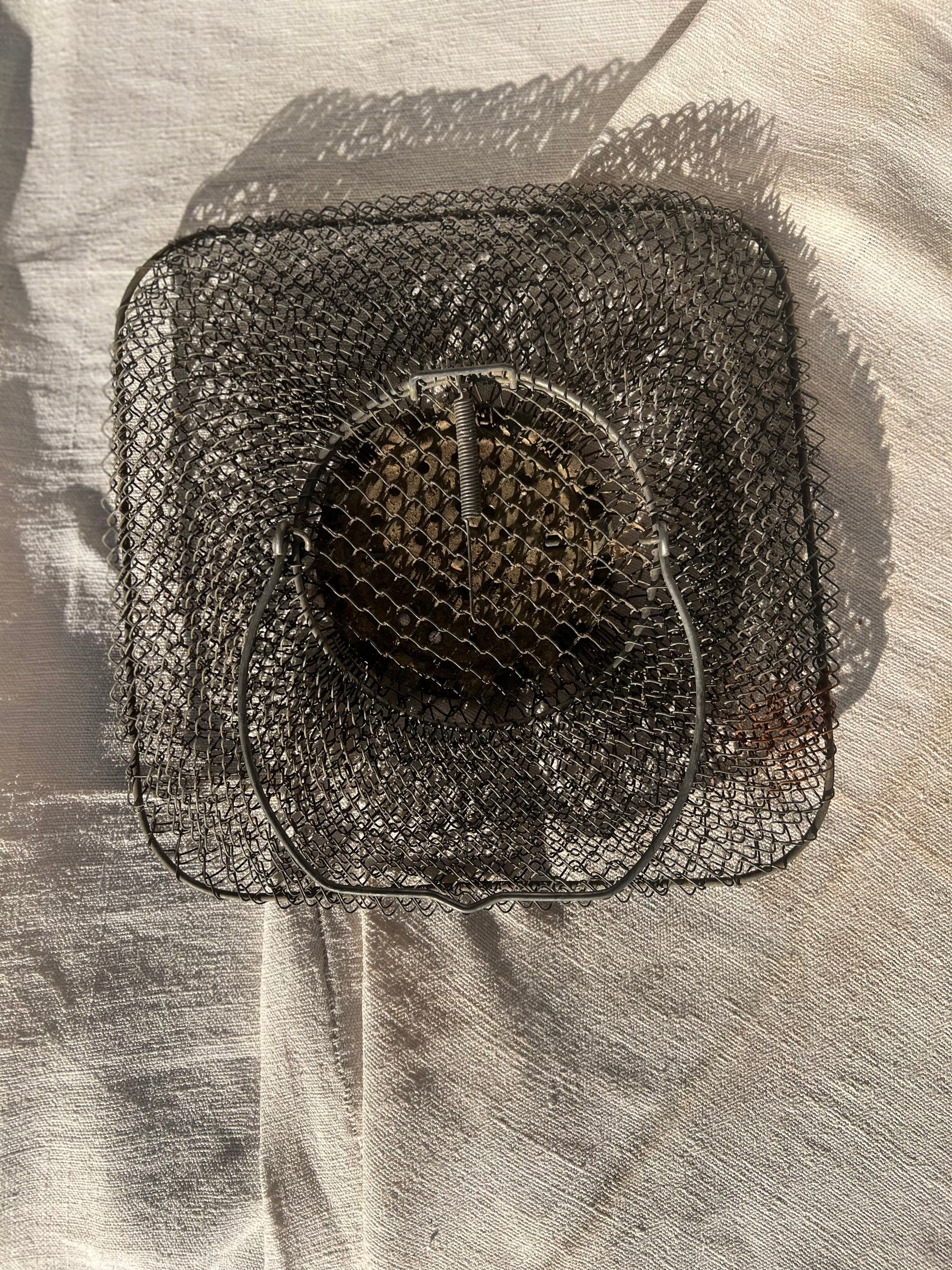 This mid-century French wire fishing basket features a tapered form with a square base and fine interlocking metal mesh. Designed for use by anglers to hold fish in the water, it has a hinged handle and a practical opening seen in photos. Today it serves as a striking decorative object — ideal as a hanging basket, sculptural storage piece, or rustic accent in farmhouse and industrial interiors.