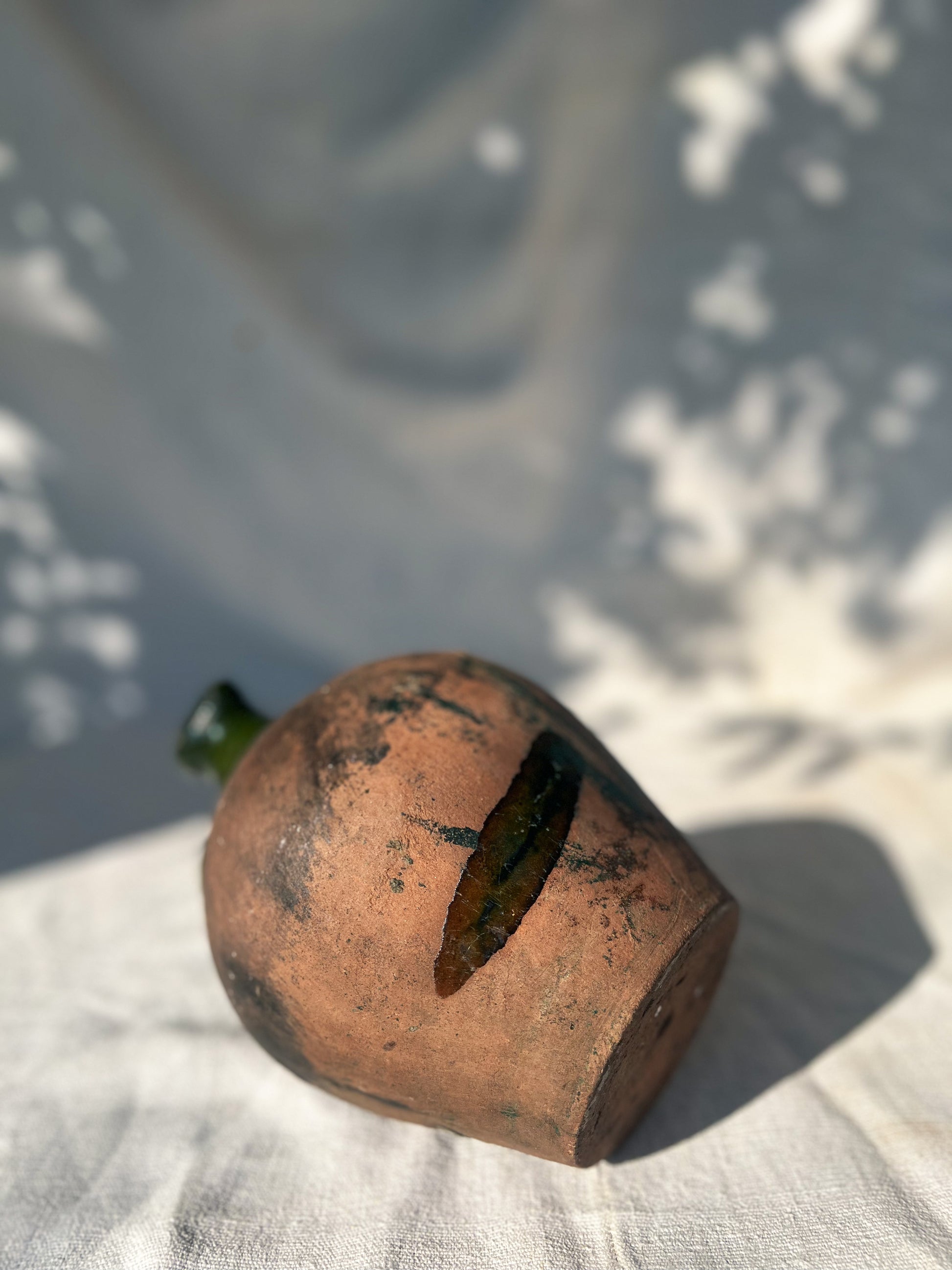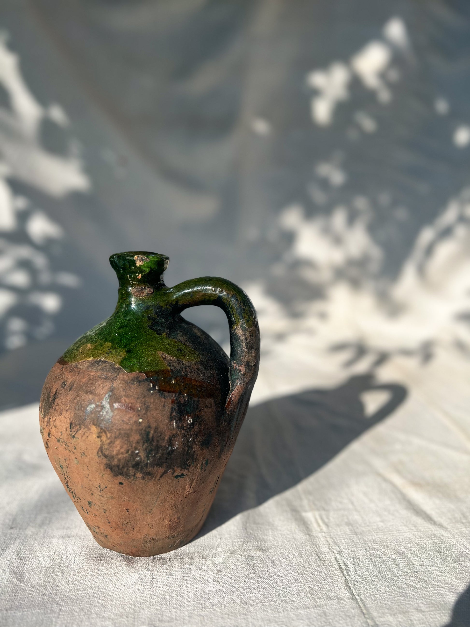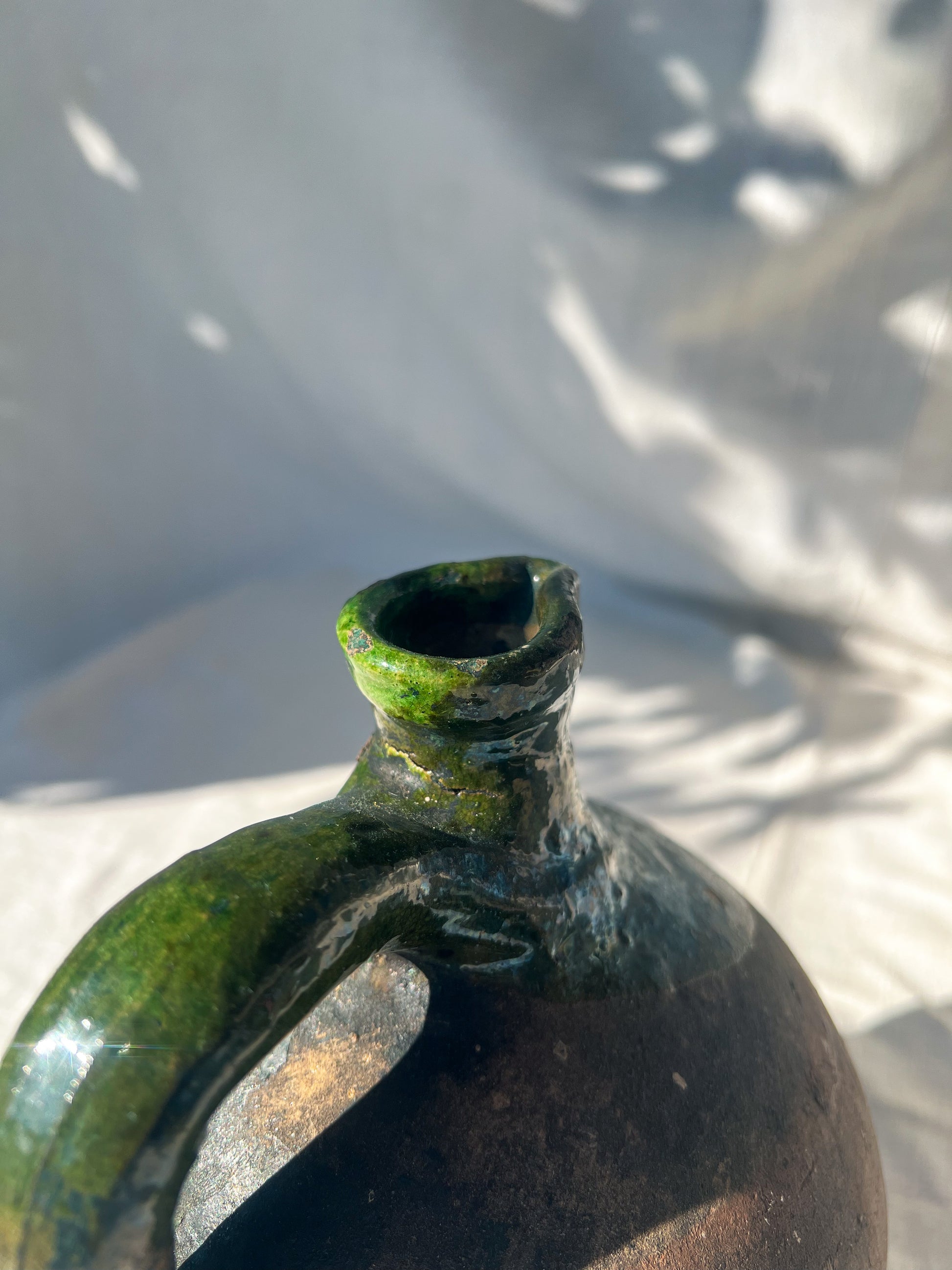 This exquisite antique French jug is a testament to time-honored craftsmanship, blending both functionality and rustic character. Likely originating from a rural pottery workshop, its organic shape and partial green glaze evoke the simple beauty of traditional French earthenware.