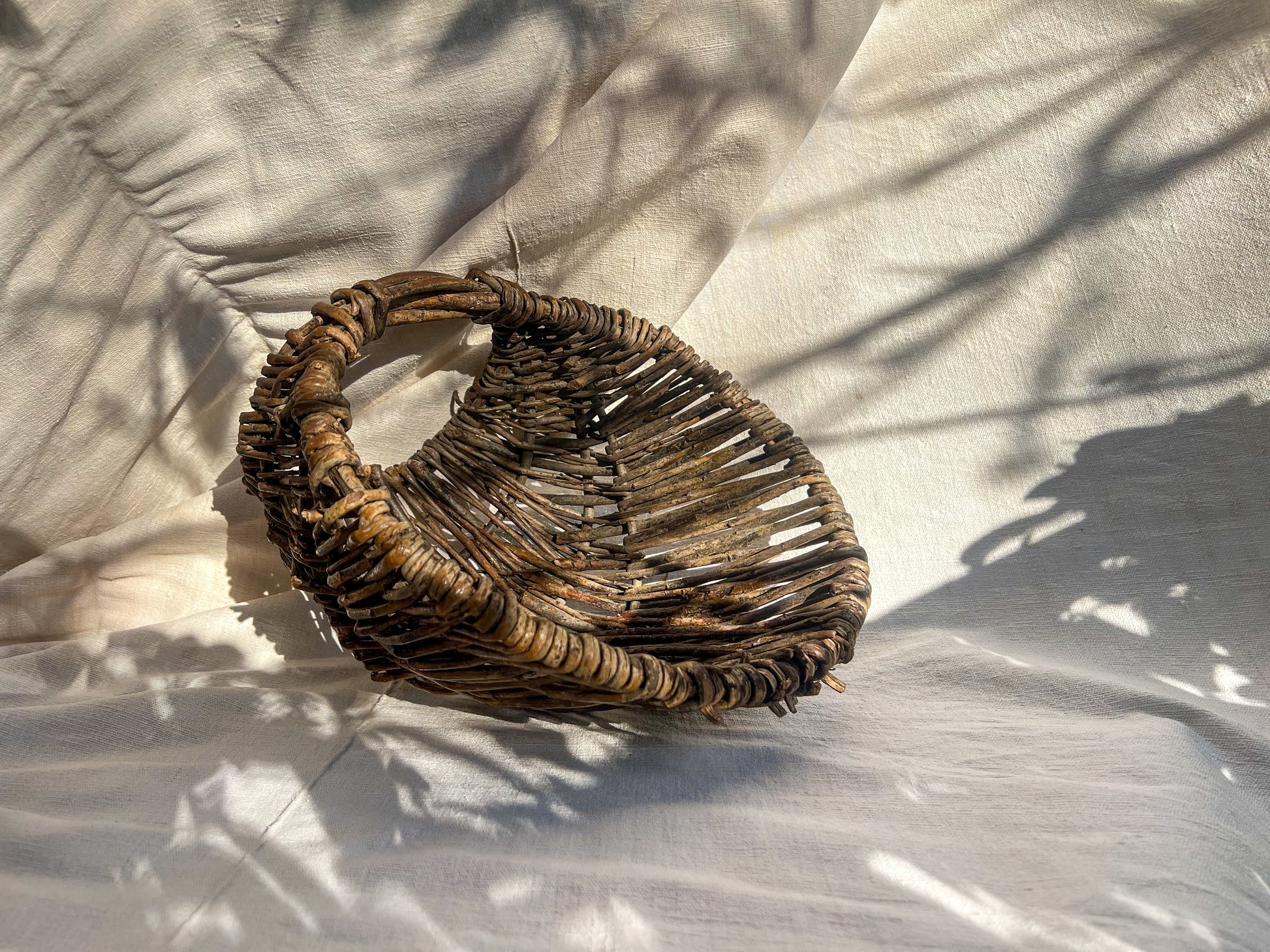This antique French wicker basket is handwoven from natural willow with a beautiful irregular form and aged patina. Its worn texture and uneven weave reflect years of use and the handmade nature of rural craftsmanship. Likely used for gathering produce or eggs, it now stands as a sculptural and rustic decorative piece, ideal for farmhouse or wabi-sabi interiors.