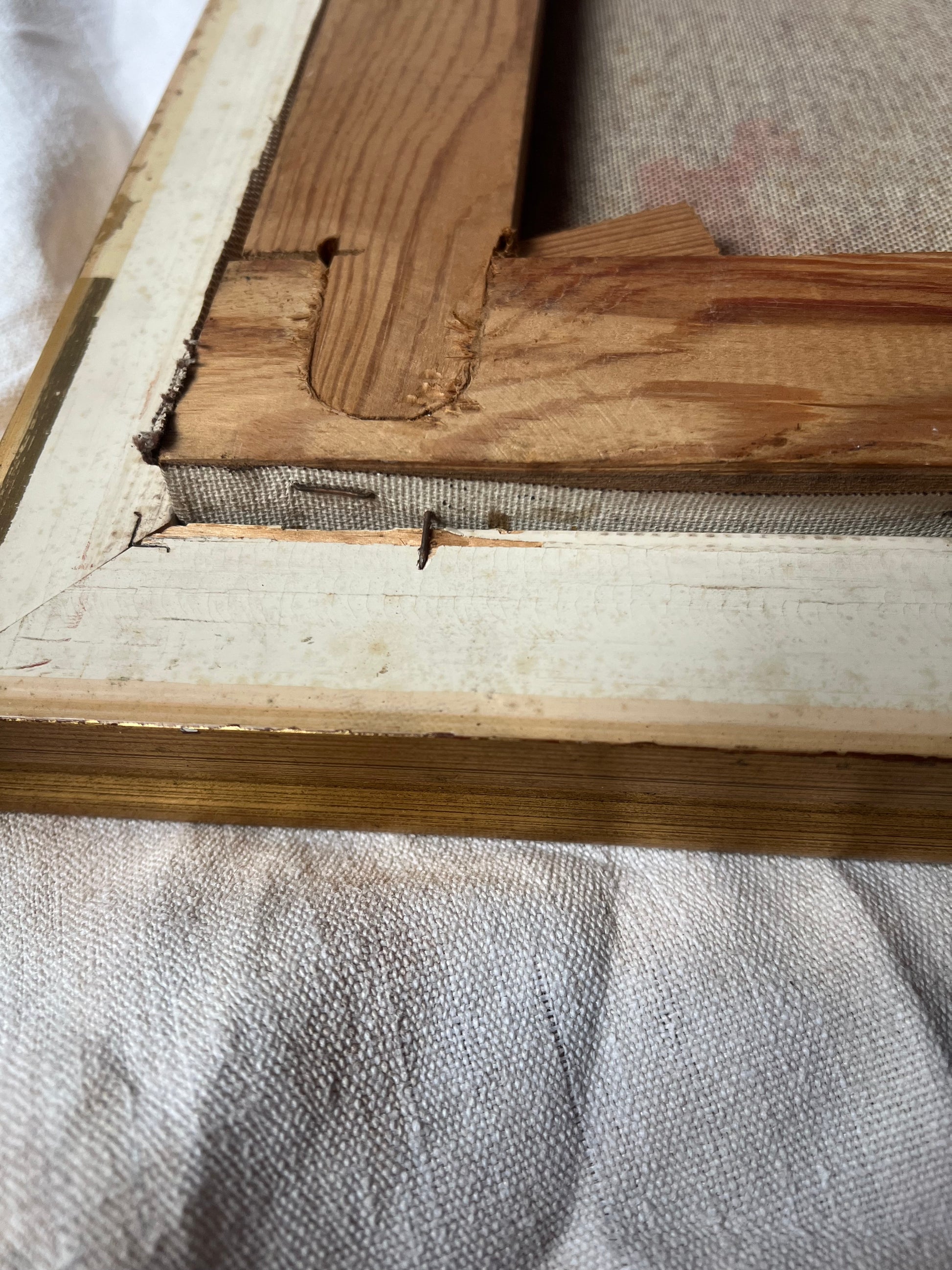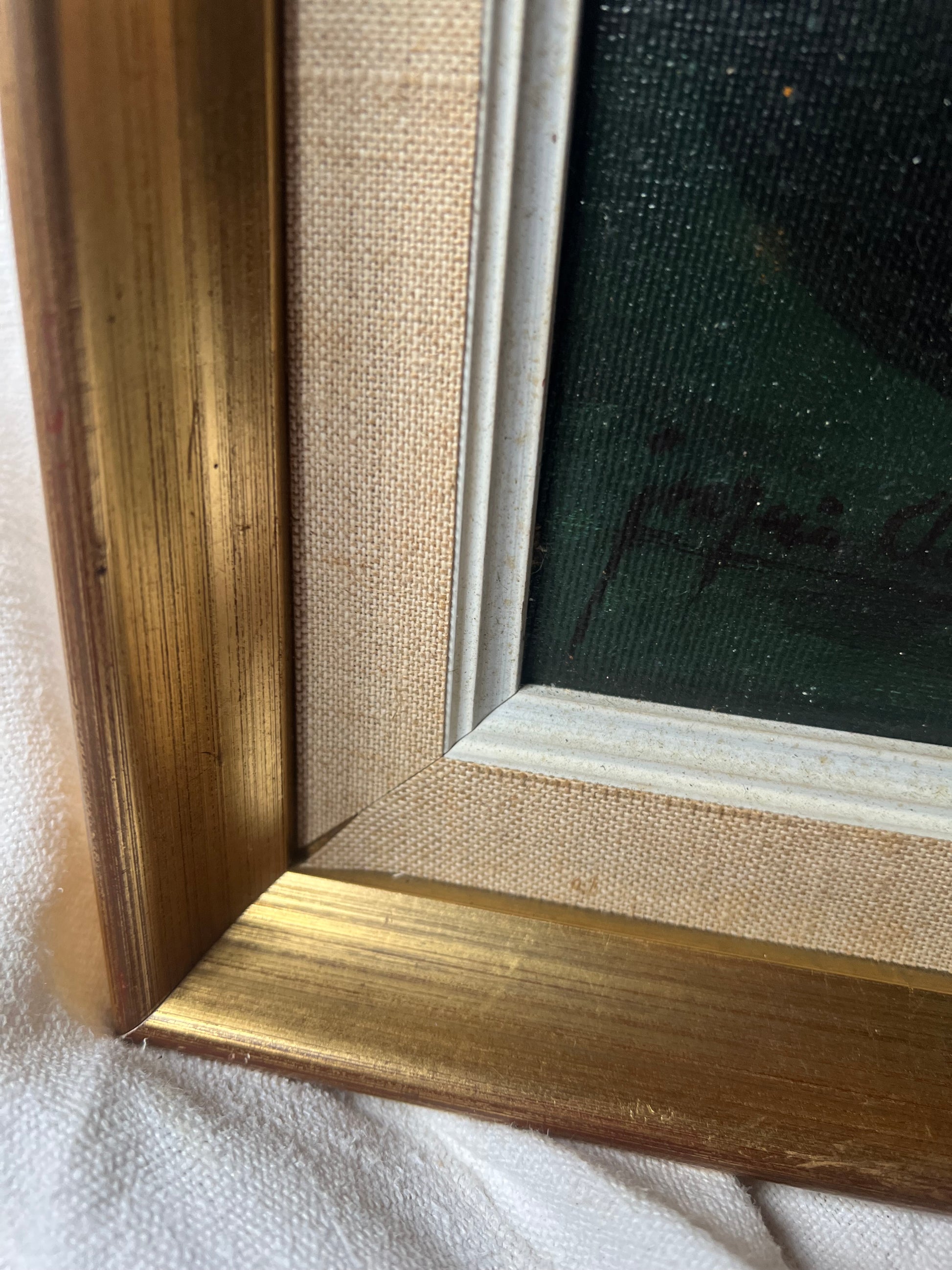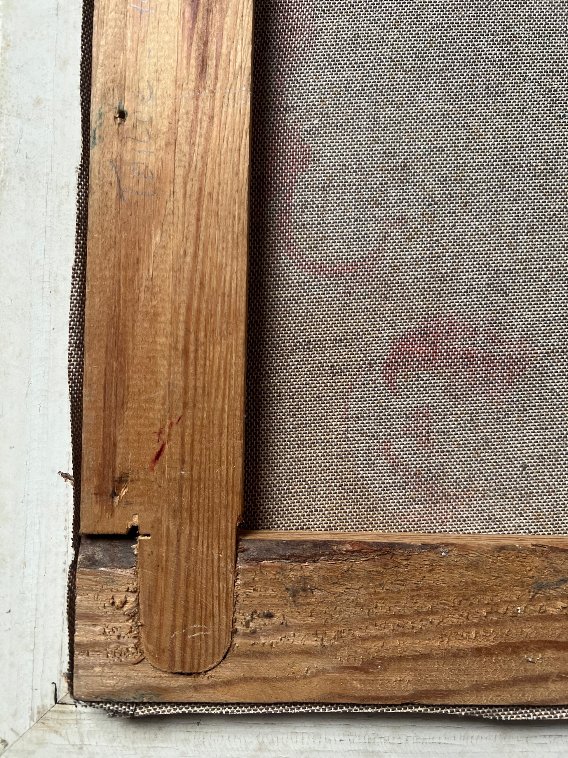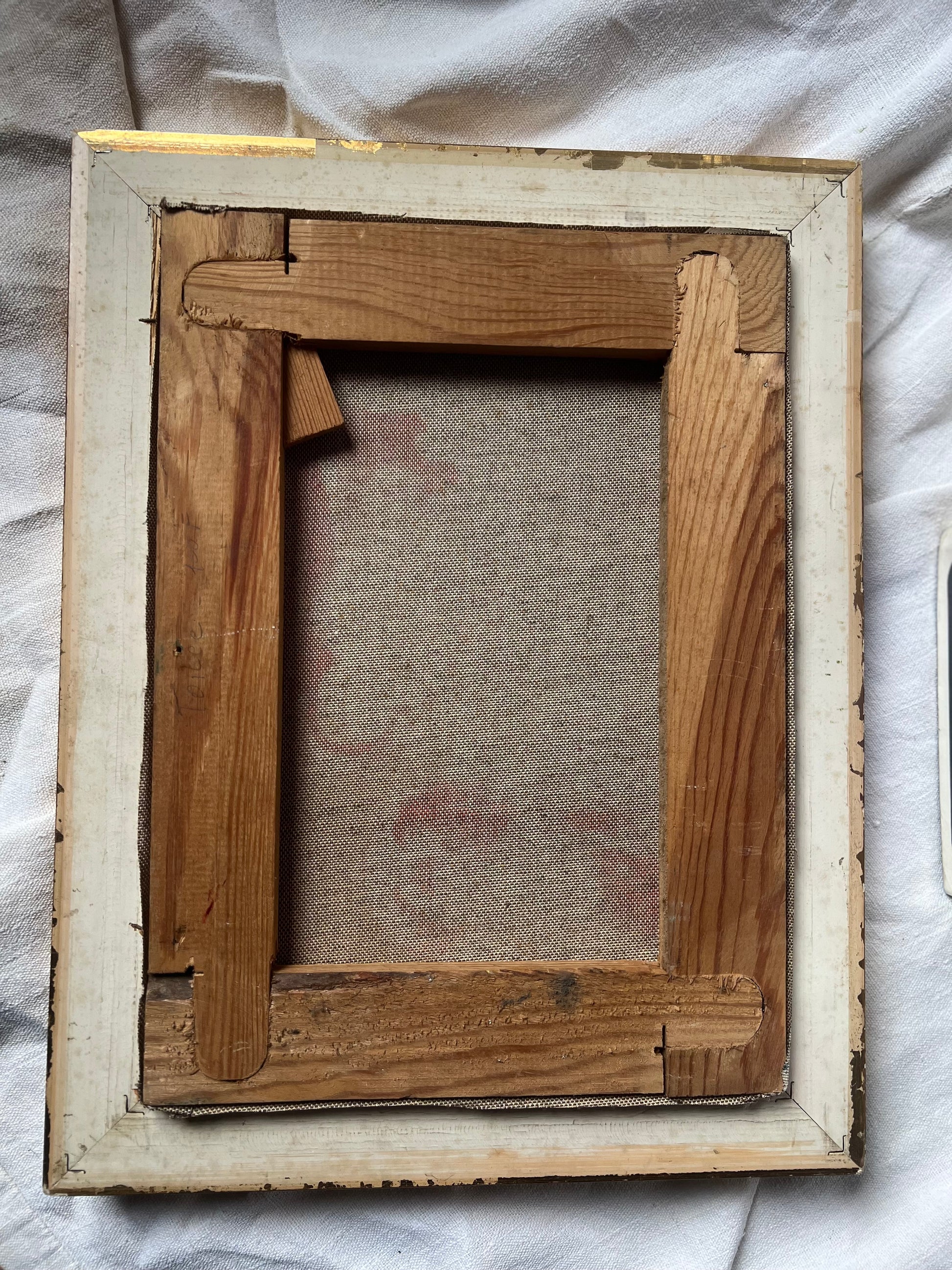 Condition: Good vintage condition with light surface wear, stable craquelure, and age-appropriate patina to the frame. Small lift in bottom right linen boarder seen in photos.